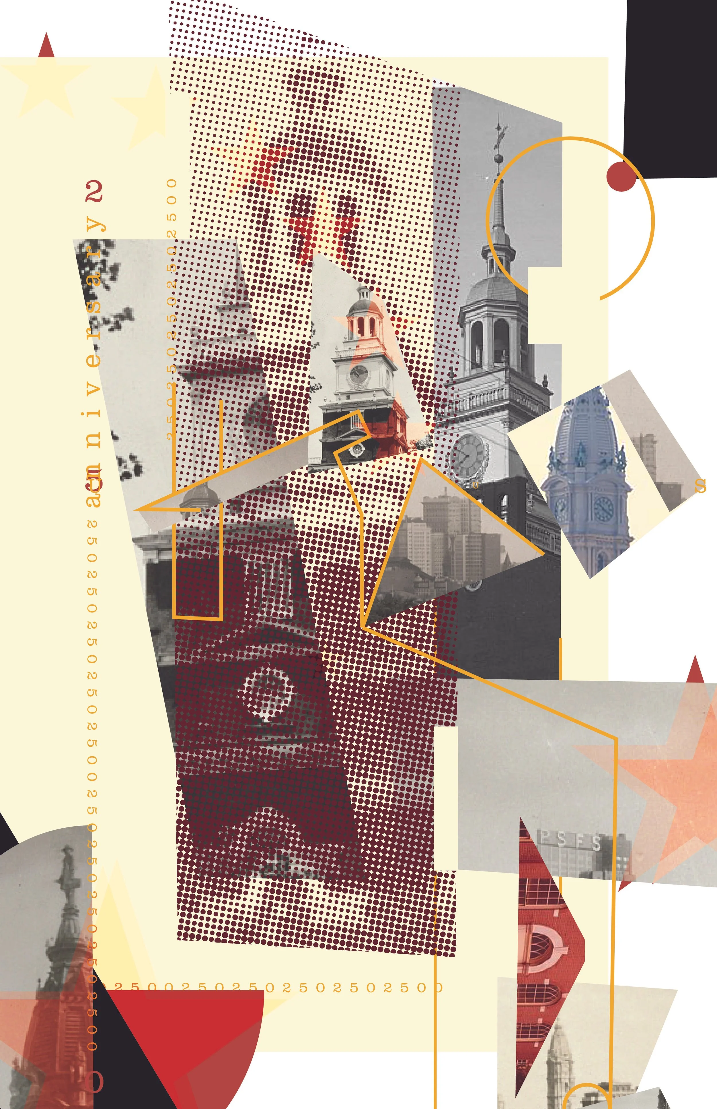 The semiquincentennial marks the 250th anniversary of the signing of the Declaration of Independence, a joyous occasion to be celebrated in 2026. By integrating collaged vintage photographs with abstract shapes, this school project creates a visual narrative that bridges the past and present, reflecting the city's ongoing evolution and its pivotal role in American history.