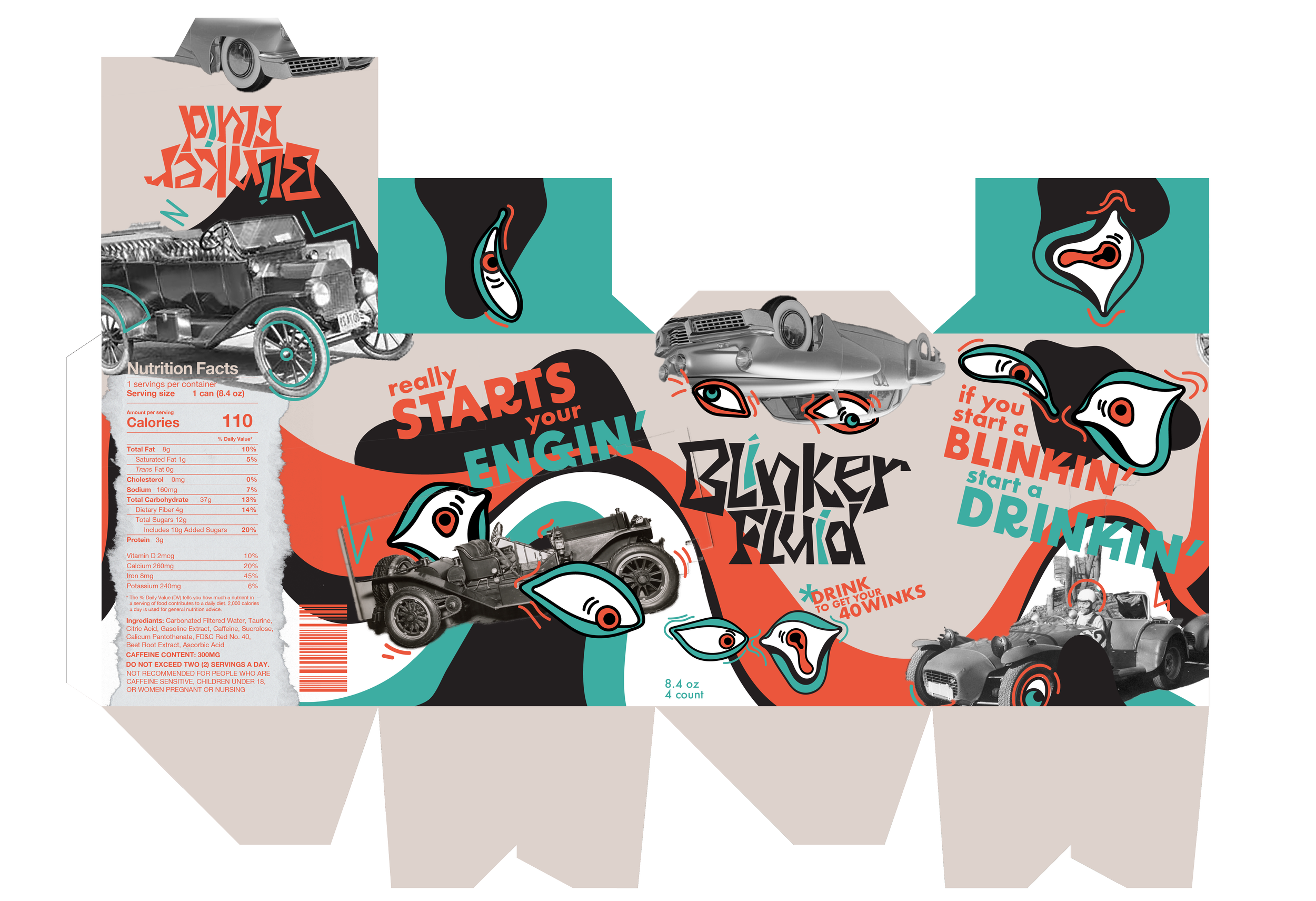 The concept design "Blinker Fluid" is a caffeinated energy drink aimed at individuals aged 18 and over, drawing inspiration from twitching eyes, vintage car imagery, and the humorous "blinker fluid" automotive prank. The packaging is intentionally chaotic, designed to evoke the energizing effect of the drink at first glance, allowing viewers to feel its intensity without taking a sip.